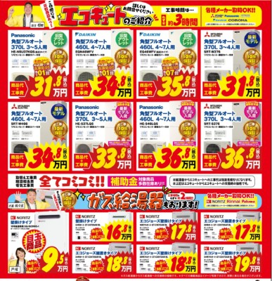チラシには最新モデルのエコキュートや各店長おススメのエコキュート、お値打ち価格の給湯器などを掲載しております。
