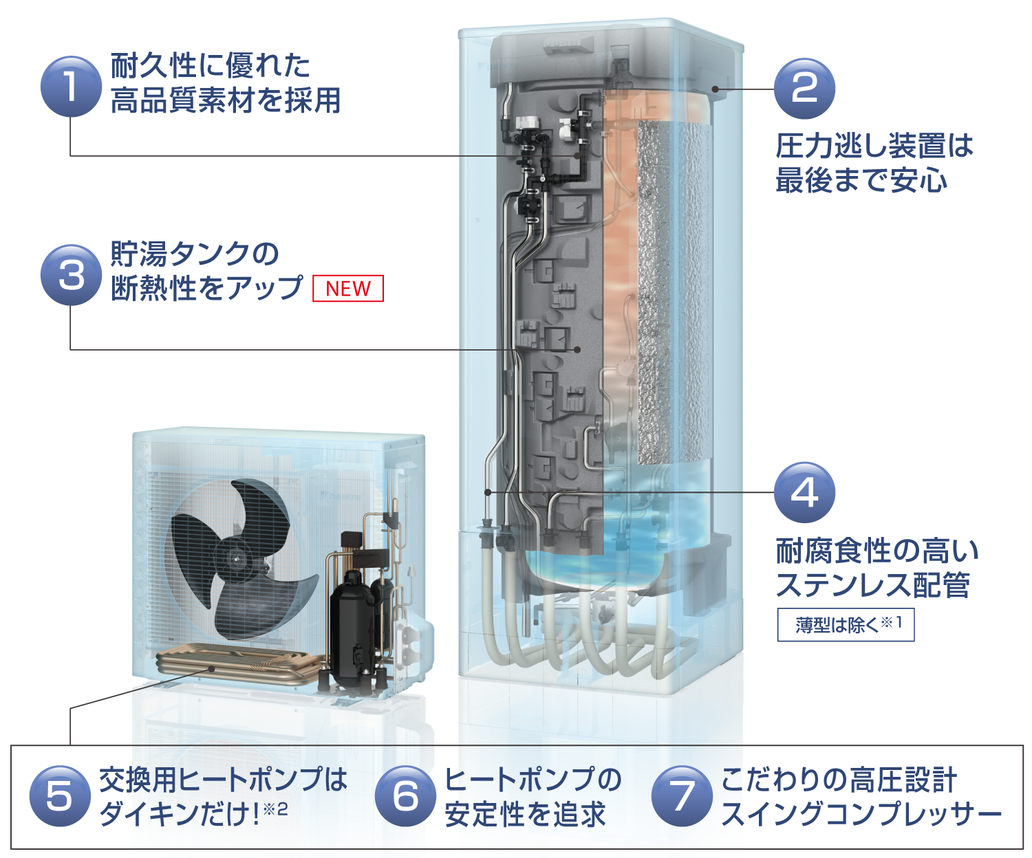 ダイキンのエコキュートは、耐久性に優れた高品質な素材を使っているのもこだわりポイントです。