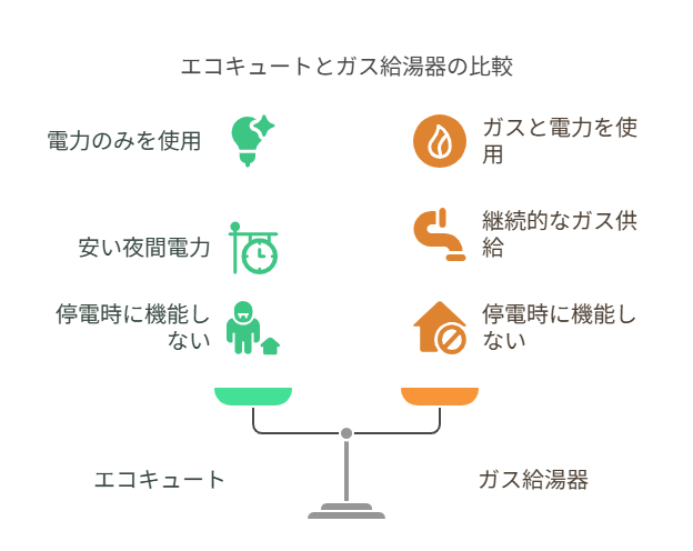 エコキュートは電気、ガス給湯器はガスをエネルギー源とする
