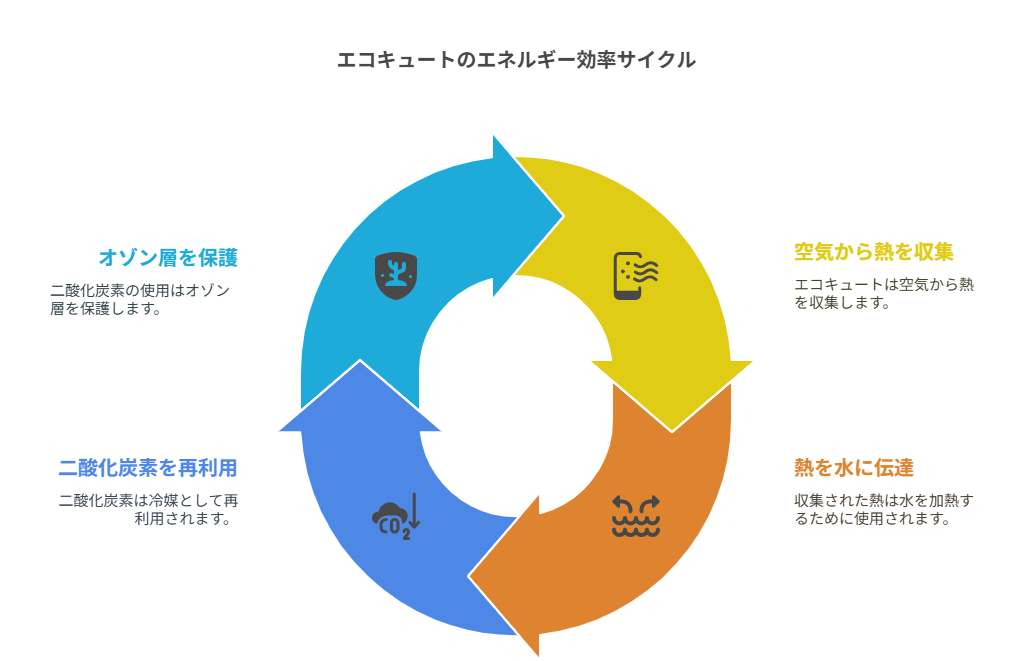 エコキュートはヒートポンプ技術を活用して空気の熱を使い、電気でお湯を沸かす仕組みで、使用するエネルギーは電力のみで、多くのオール電化住宅で採用されています。