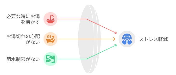 貯湯タンクから取り出せるので、必要な時にお湯が使えるため安心ですが、温度調整ができないため、湯温が低かったり熱すぎたりする可能性があります。