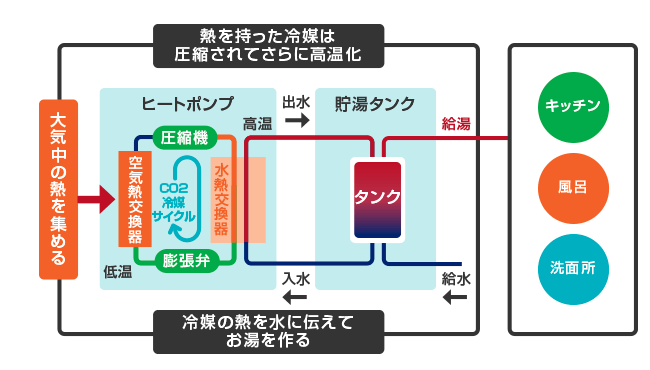 ガス給湯器やこれまでの電気温水器に比べてエネルギー効率が高く、効率が良いのが特徴です。