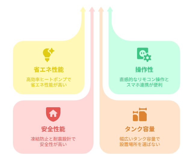 それぞれに特徴がありますが、三菱エコキュートは「清潔性」と「使いやすさ」で特に評価されています。