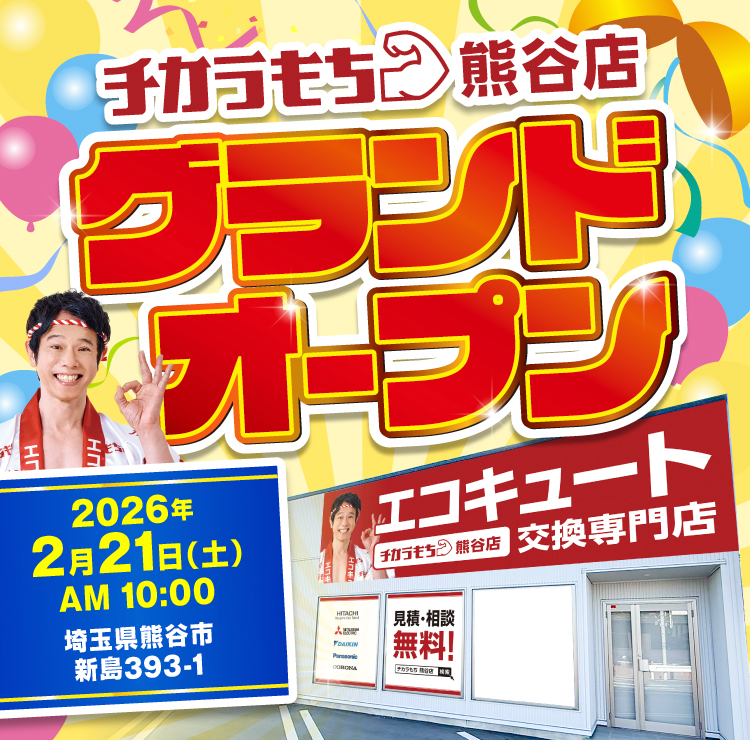 熊谷市(熊谷・妻沼・大里・江南・籠原エリア含む)の皆様、こんにちは!給湯器・エコキュート交換専門店の「チカラもち熊谷店」です。
