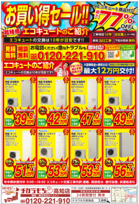 エコキュート交換工事なら「チカラもち高知店」へ!!