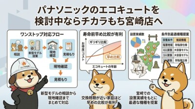 同じパナソニックのエコキュートでも、宮崎では全国一律の感覚で決めない方が安全です。 沿岸部の塩害、設置スペース、既設給湯器の違い、家族人数など、地域や住まいの条件で選び方が変わるからです。 エコキュートは家電ではなく住宅設備です。 だからこそ、宮崎では「カタログ比較」だけでなく「設置環境との相性」まで見る必要があります。