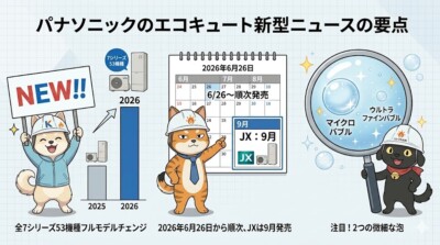 今回の発表は、単なる小さな仕様変更ではありません。 パナソニックの2026年モデルは、「泡の機能強化」と「省エネ性の向上」を同時に打ち出した大きな刷新です。 宮崎でエコキュート交換を考えている方にとっても、かなり注目度の高い内容ですよ 😊