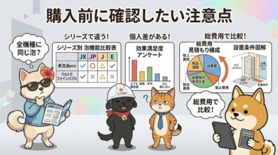 今回の新型は魅力がありますが、「新型だから全部よい」と単純化するのは危険です。 搭載機能の違い、体感の個人差、工事条件まで見ないと、あとから「思っていたのと違う」となりやすいです。 ここは、購入前にしっかり整理しておきたいポイントです。