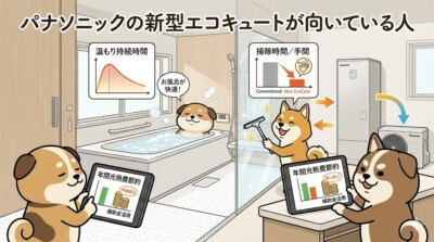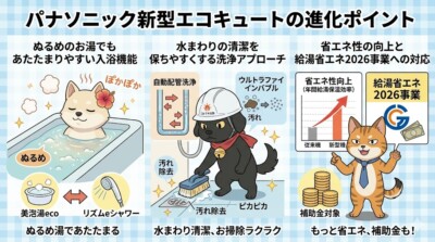 もちろん、エコキュートの本筋である省エネ性も見逃せません。 今回の新型は、快適性だけでなく効率面にも配慮されていて、補助金対象モデルとして検討しやすい点も強みです。 「新機能が面白い」だけで選ぶのではなく、補助金とランニングコストまで含めて比較することが大切です。