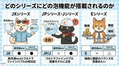 最も大事なのはここです。 今回の新型では、全シリーズに全く同じ泡機能が入るわけではありません。 「美泡湯ecoも欲しい」と思っていても、選ぶシリーズによっては想定とズレることがあります。 先に、どのシリーズに何が載るのかを整理してから比較するのが正解です。