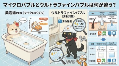 同じではありません。 美泡湯ecoは入浴の快適性や温もりの持続を重視した機能、ウルトラファインバブルは皮脂汚れや水まわりの汚れ対策に注目した機能です。 つまり、「気持ちよさ重視」か「清潔性重視」かで方向性が違います。