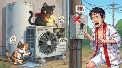 エコキュートの内部には高電圧がかかる部品があります。 しかも屋外設置機器なので、雨や湿気の影響を受けている場合もあります。 「少し見てみるだけ」のつもりでも、感電、部品破損、症状悪化につながるおそれがあります。 見るのは外観まで。中は触らない。この線引きが大切です。