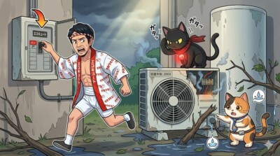 夜間の沸き上げ運転で負荷がかかったときに、不具合が表面化している可能性があります。劣化した部品、漏電、ヒートポンプ側の不具合、配線や接続部の弱りなどが考えられます。雨の日や台風の後にブレーカーが落ちた場合はどうすればいいですか?
