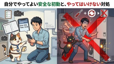 エコキュートのブレーカーが落ちると、つい「とりあえず復旧させたい」と思いますよね。 でも、漏電や内部故障が関係している場合は、自己判断の操作で悪化することがあります。 安全な初動は、状況を整理すること。危険な対処は、原因が分からないまま通電や分解を繰り返すことです。