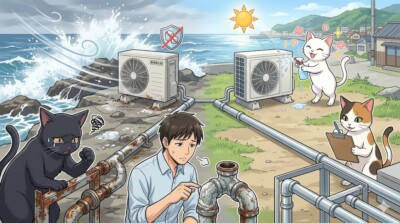 本体だけ耐塩害仕様でも、周辺部材まで意識しなければ片手落ちです。 配管、架台、固定金具、設置面の条件まで見ておかないと、機器本体だけ対策しても不十分になりやすいです。 実際には設置工事の品質もかなり大事です。 海沿い住宅では、本体だけ見て終わりにしないことが差になります。