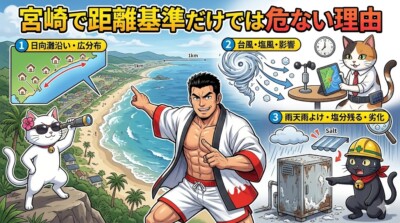 ここはかなり重要です。 耐塩害仕様が必要かどうかは、「宮崎市だから必要」「日南だから必要」という決め方ではありません。 メーカーが見ているのは、家の住所よりも、室外機の設置場所そのものです。 海までの距離、海側か山側か、建物の表か裏か、雨が当たるか、建物の影になるか。 こうした条件で判断が変わります。 逆に、住所だけ見て「海から少し離れているから大丈夫」と決めるのは雑です。 チカラもち宮崎店のように、現地の設置条件まで見て判断する進め方の方が、宮崎では現実的です (`・ω・´)ゞ