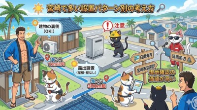 同じ「海沿い住宅」でも、機器をどこに置くかで判断はかなり変わります。 宮崎では海岸線が長く、海に近い住宅地そのものが珍しくありません。 そのため、沿岸エリアの住宅では、同じ市内でも立地条件がかなり違います。 型番だけ先に決めるより、設置パターンごとに見た方が失敗しにくいです。