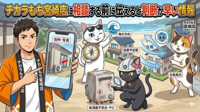 最後までお読みいただきありがとうございます。 宮崎の海沿い住宅では、海からの距離だけでなく、風向き、置き場所、雨の当たり方まで見ておくことが大切です。 チカラもち宮崎店では、こうした地域特有の条件もふまえて、できるだけ分かりやすくご案内しています。 「うちは標準仕様で大丈夫?」「耐塩害仕様を見た方がいい?」と迷ったら、まずはお気軽にご相談ください 😊