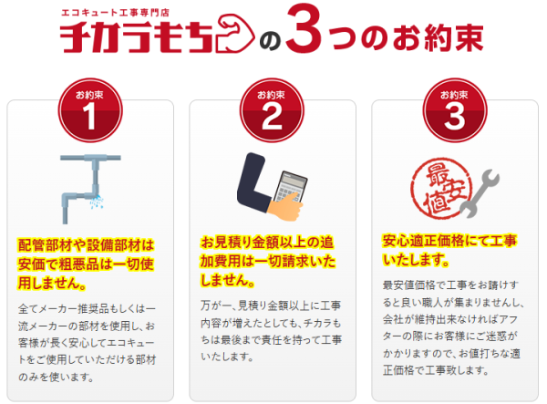 また、本体の寿命は10年ほどと言われていますので「チカラもち」の10年保証なら、実質、本体が寿命を迎えるまでの間、保証が続きますので、安心してお使いいただくことができます。緊急時には駆けつけサービスも心強い存在です!