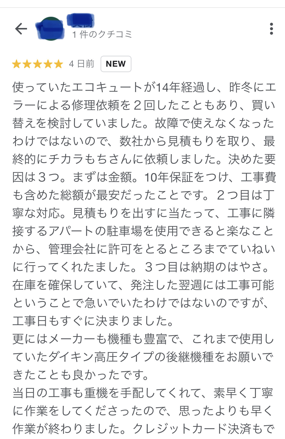 お客様がGoogleクチコミに投稿いただいた内容は下記となります(^^)