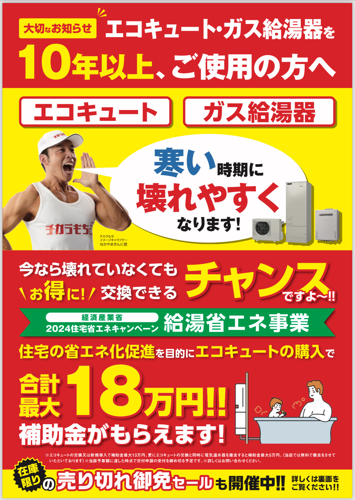 ”なかやまきんに君”のテレビCMでお馴染みの給湯器 交換・電気温水器 交換・エコキュート 交換の専門店「チカラもち新潟店」です!