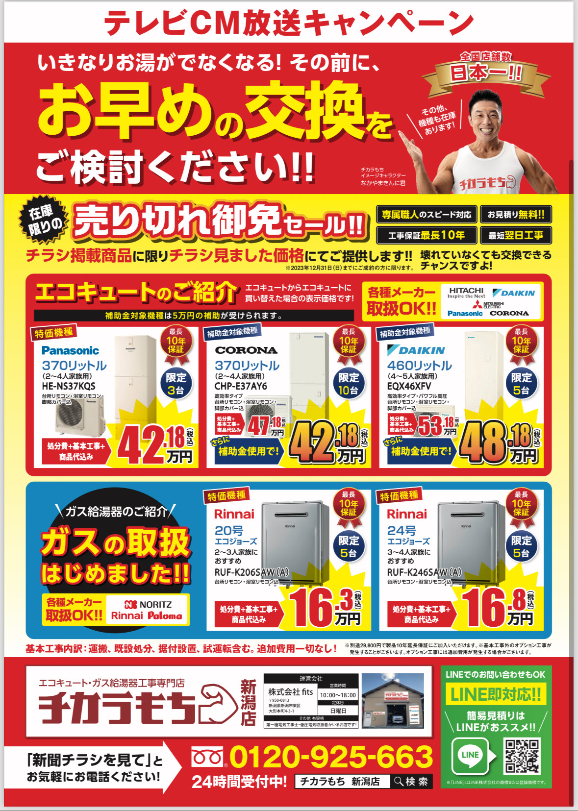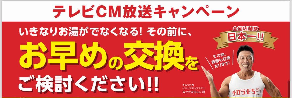 新潟でなかやまきんに君のCMでお馴染みの給湯器 交換・ガス給湯器 交換・電気温水器 交換・エコキュート 交換の専門店「チカラもち新潟店」です!