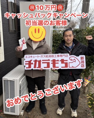 本キャンペーンは、エコキュート交換工事をご依頼いただいたお客様の中から、毎月抽選で1名様に10万円をキャッシュバックする、チカラもち新潟店独自の特別企画です。