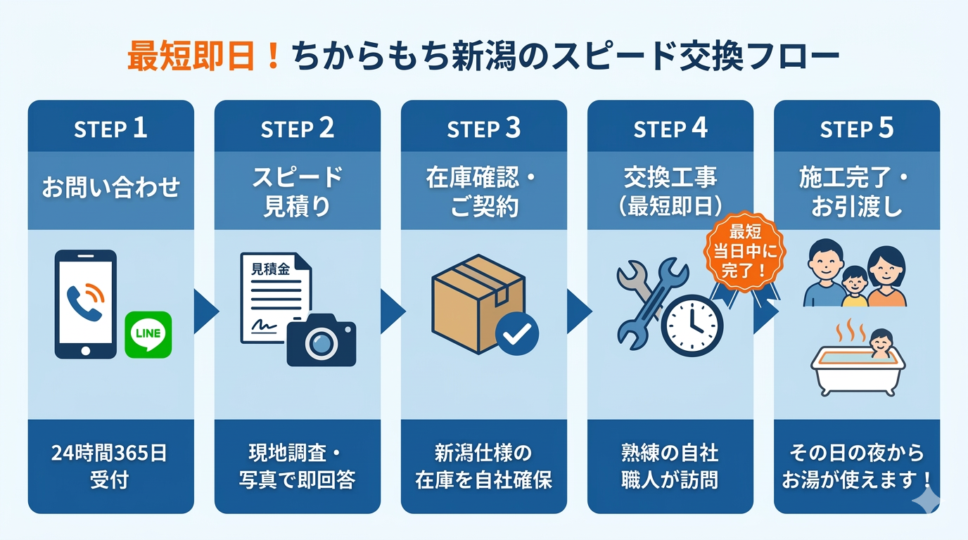 お湯が使えないストレスは、一刻も早く解消されるべきです。ちからもち新潟では自社倉庫に豊富な在庫を確保しており、最短即日、遅くとも数日以内には交換工事を完了できるスピード体制を整えています。
