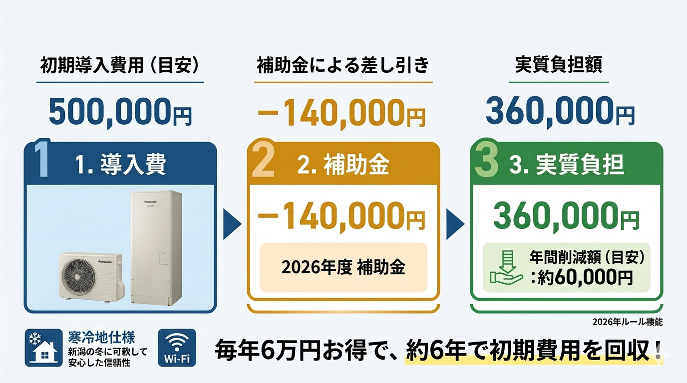 - 2026年度補助金を活用し、最大14万円お得に交換。