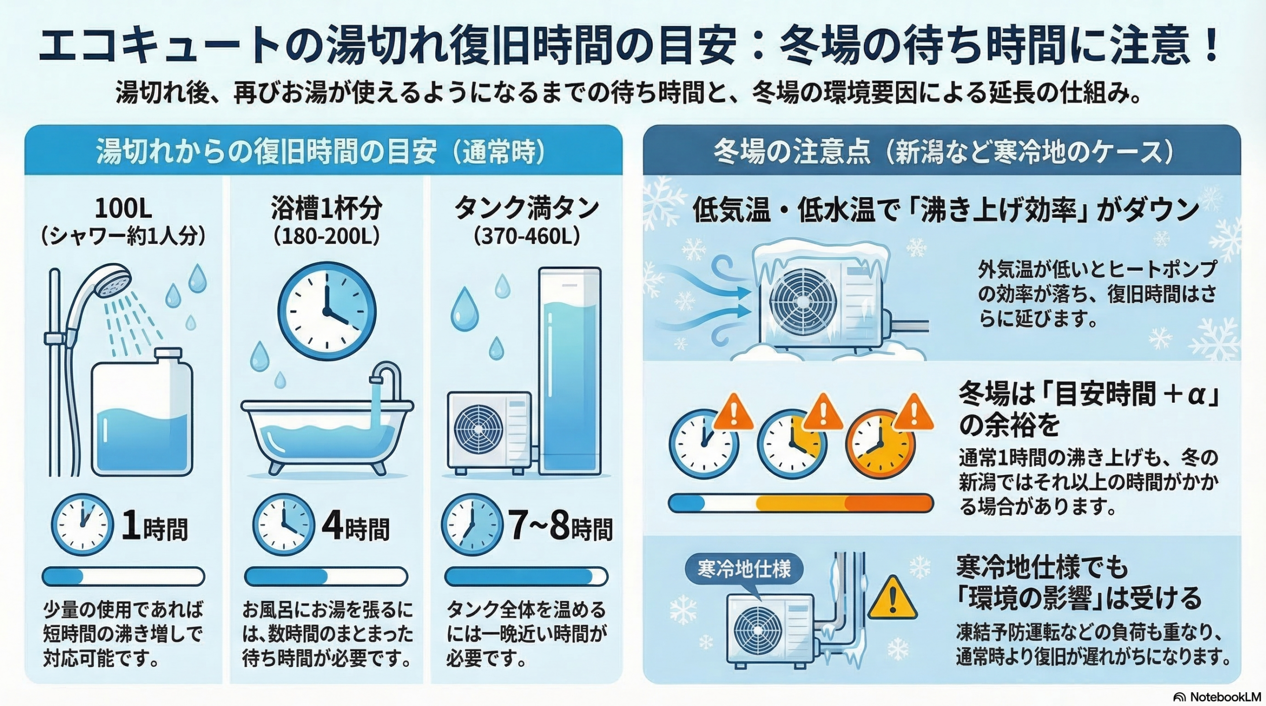 新潟の冬は水道水の温度が非常に低く、外気温も氷点下になることがあります。エコキュートはヒートポンプ技術で空気の熱を集めてお湯を沸かすため、外気温が低い冬場は沸き上げ効率が著しく低下します。そのため、夏場であれば1時間で沸く量であっても、新潟の冬場は1.5倍から2倍近くの時間がかかってしまうケースも珍しくありません。