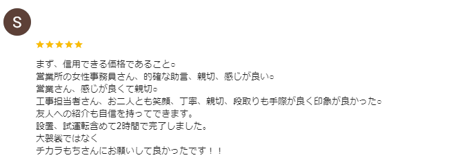 「今まで使っていたエコキュートの具合が悪くなってしまい困っていた所に嫁の知り合いが(チカラもち)さんのチラシを持って来てくれて丁度良い物が有り問い合わせてみました、見積もりを頼む前は(これも追加あれも追加)と言われるかと心配しておりましたが必要最小限で一番ベストな見積もりをして下さりとても安心しました。