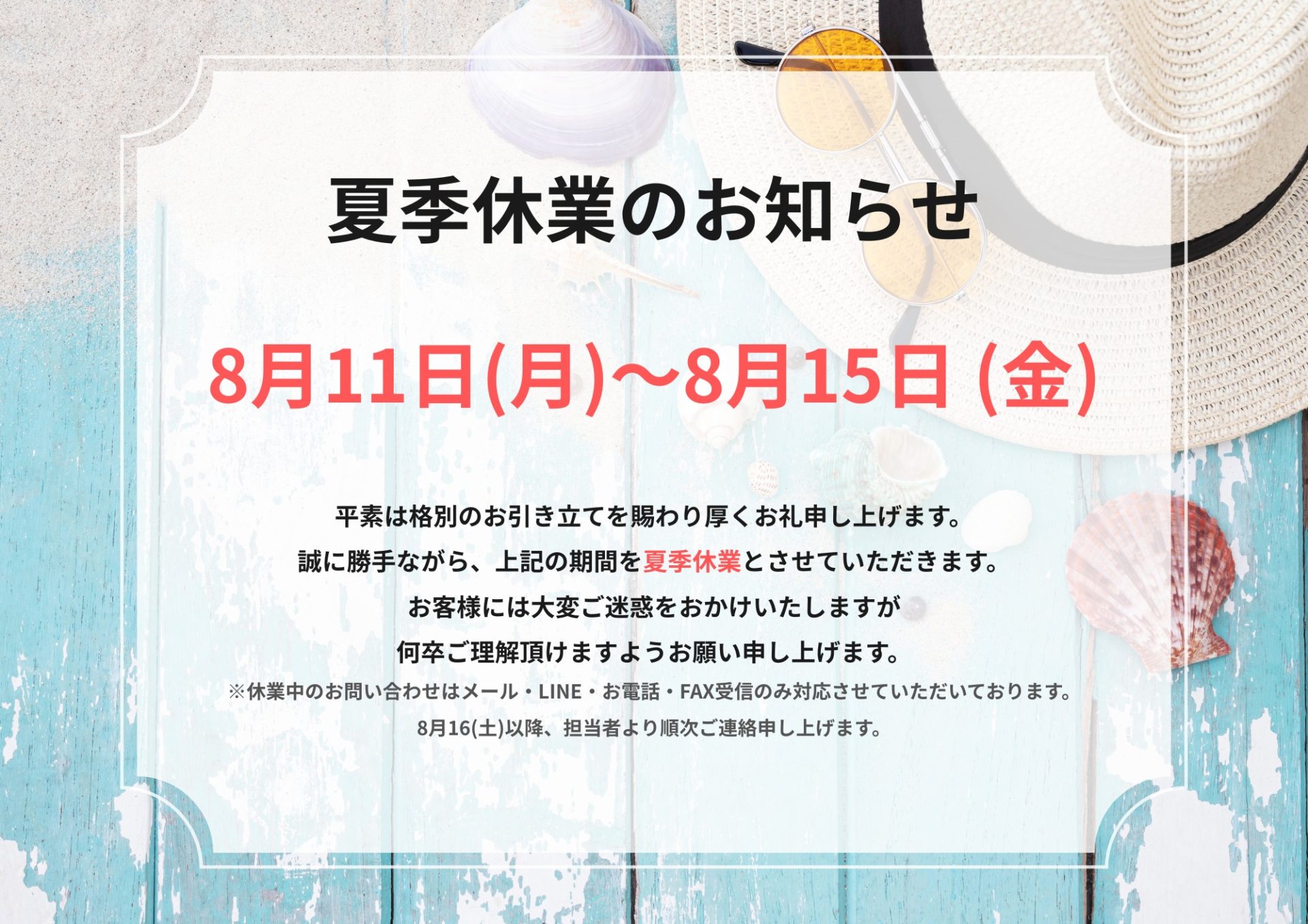 誠に勝手なが夏季休業のため、8/11(月)~15(金)の5日間を臨時休業とさせていただきます。