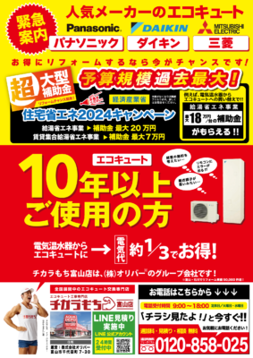エコキュートの交換をお考えですか?【チカラもち富山店】では、エコキュート交換工事をメインに、給湯省エネ2024に対応した最新の省エネ型給湯器を取り扱っています。給湯器の交換は、今がチャンス!給湯省エネ2024の取り組みが進んでいる今、エコキュートをはじめとするエコな給湯器の需要が高まっています。